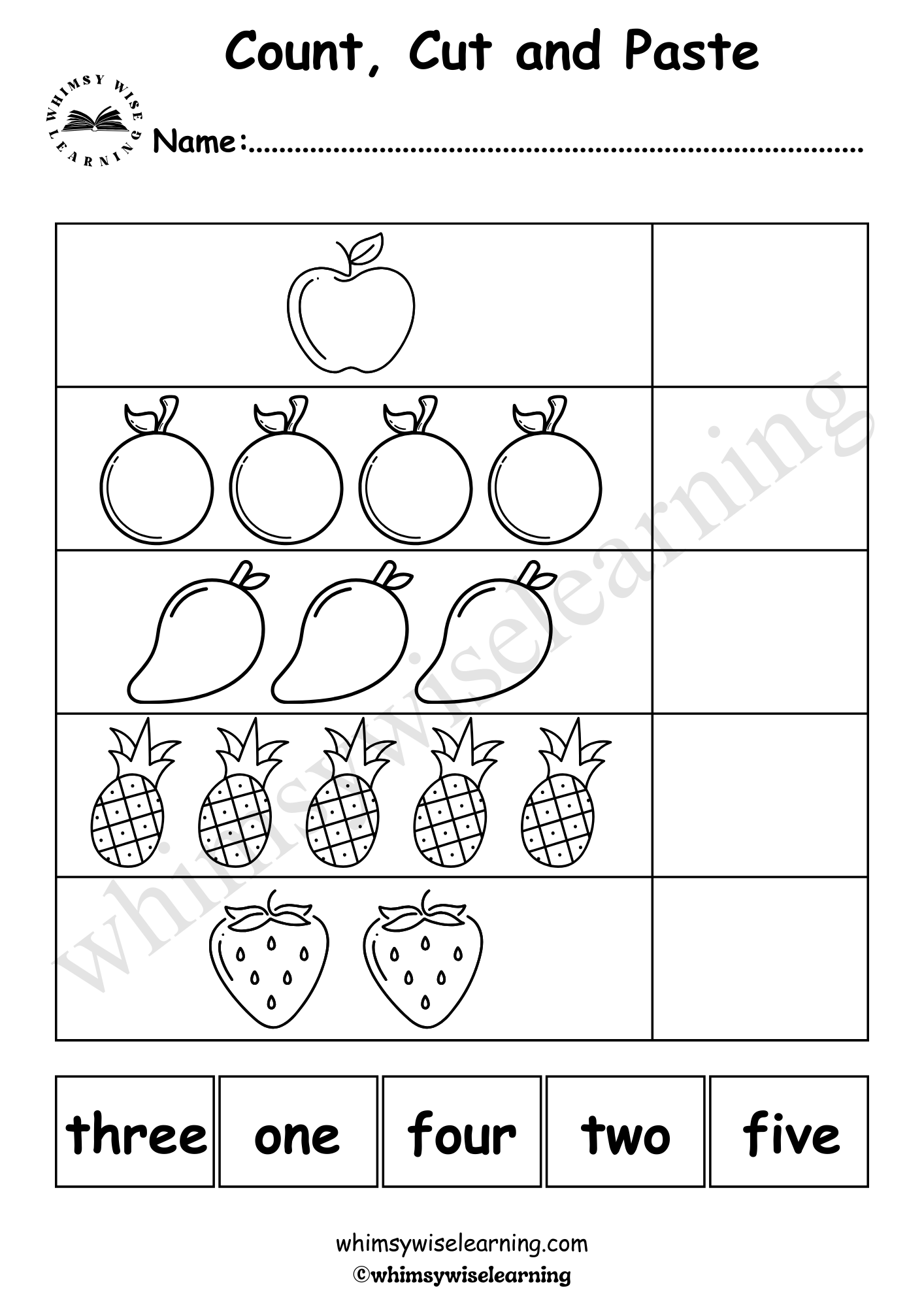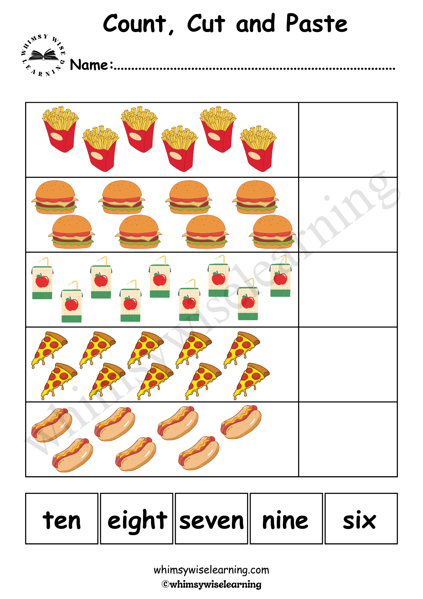 This counting worksheet focuses on numbers in words and is designed for counting, then cutting and pasting the answer. It is friendly for little ones who may not be ready for writing yet but are ready to practice counting.